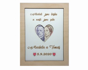 Nevíte čím obdarovat novomanželé? Peníze jsou vždy praktickým dárkem a s rámečkem od nás si budou svůj výjmečný den navždy pamatovat. Po vyndání peněz je možné do rámečku vložit malou fotografii.