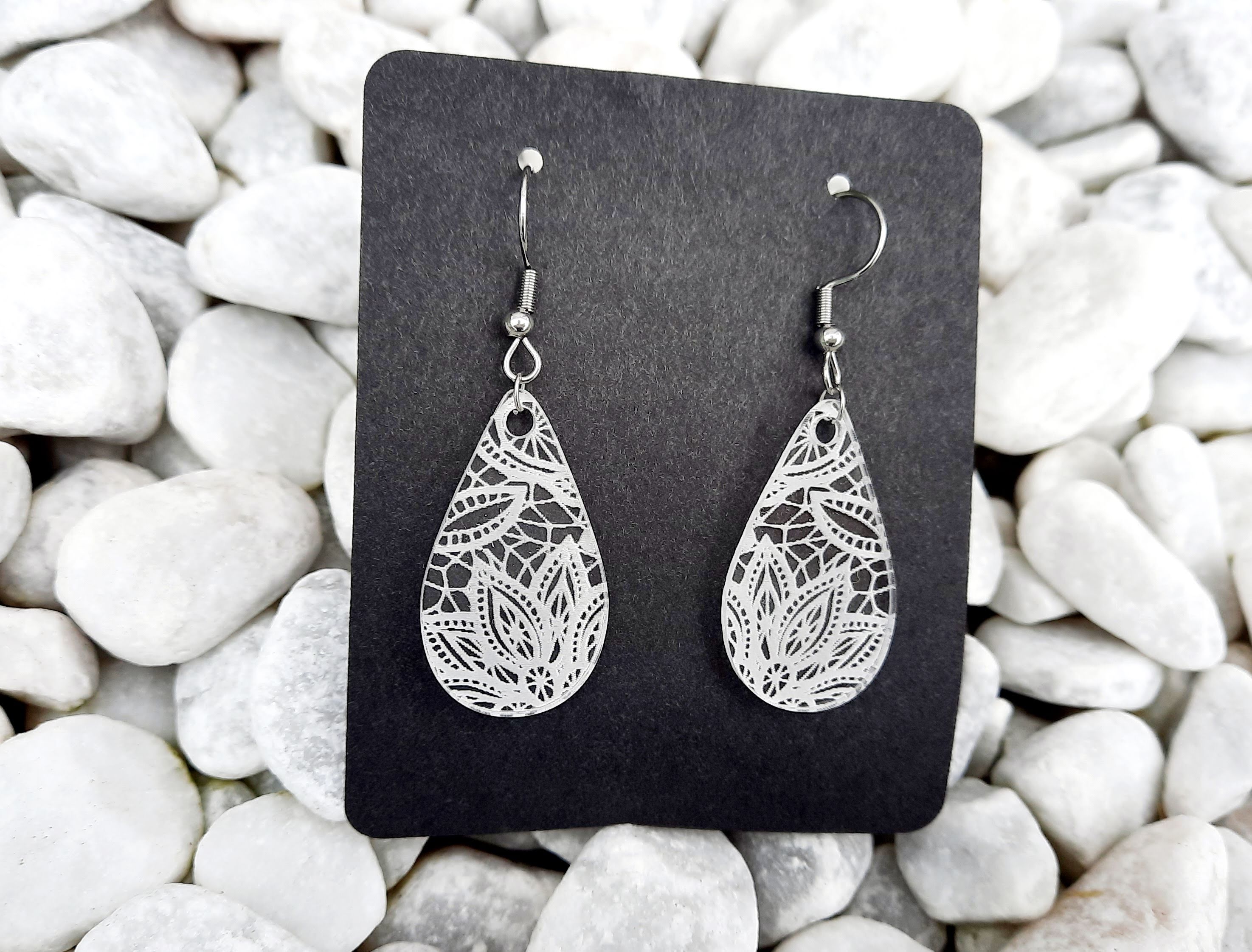 Náušnice z průhledného akrylu. Háčky jsou z nerezové ocele. Jsou opatřeny silikonovými zarážkami. V případě potřeby je můžete umýt vodou a mýdlem.
