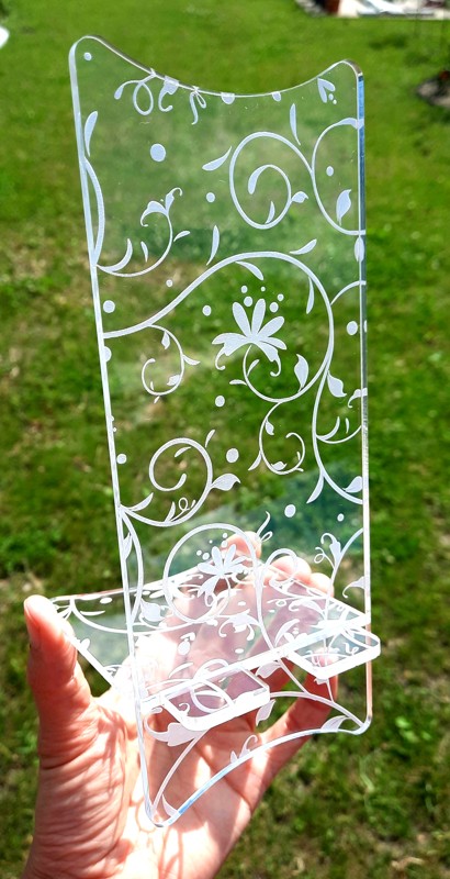 Stylový stojánek na mobil vyrobený z kvalitního tvrdého plexiskla, vzhledově velmi podobého sklu.