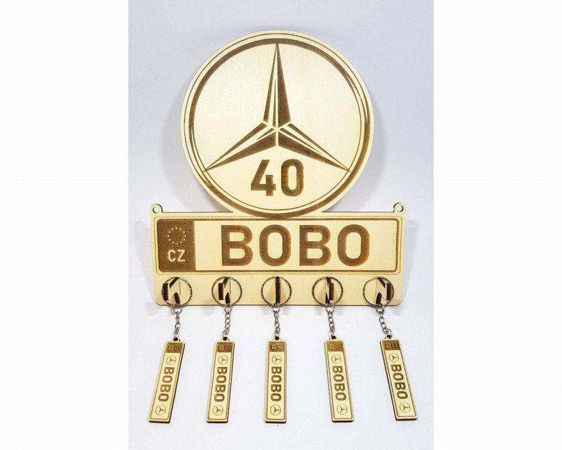 Kvalitní sestava věšáku na 5 sad klíčů s motivem SPZ, výročí a loga auta včetně sady 5ti klíčenek v detailním provedení. Vyrobeno ze ze 4mm topolové překližky s precizní povrchovou úpravou.