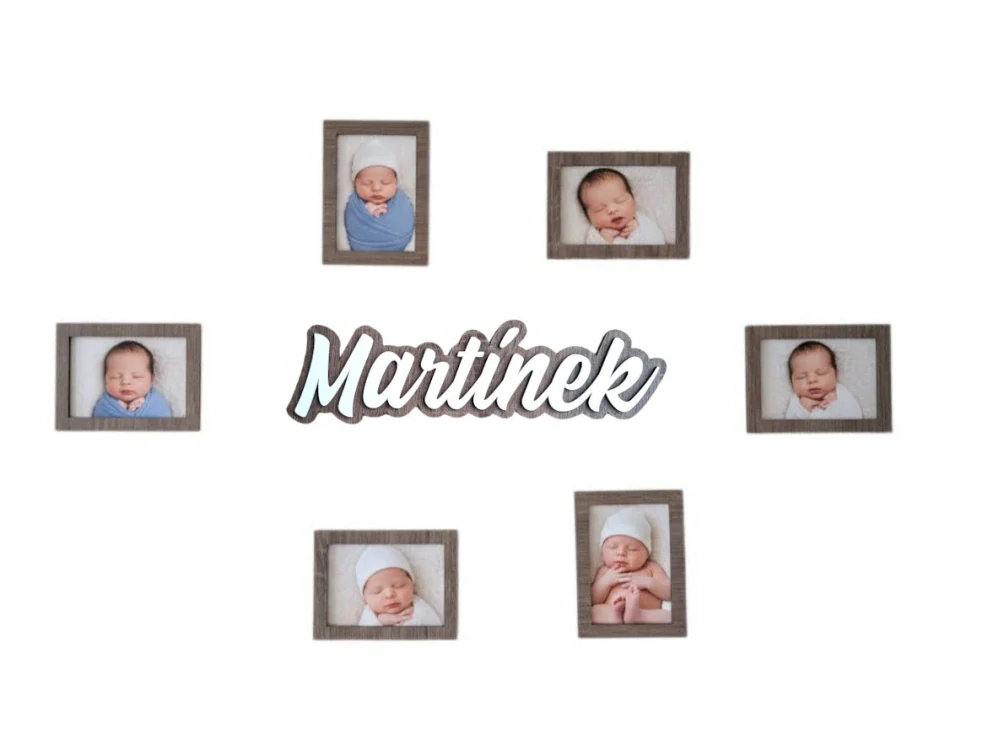 - Sada 6 fotorámečků: Rámečky v dřevěném dekoru ladící se zbytkem sady, určené pro první fotografie vašeho miminka. Do fotorámečků fotky jednoduše zasunete, takže je můzete kdykoliv měnit.