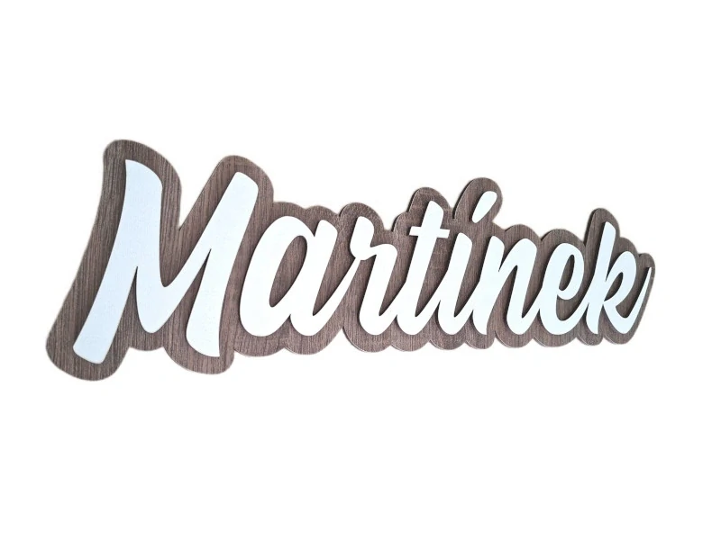 - Spodní vrstva(obrys): Elegantní dekor dub sonoma nebo tmavší hnědý dekor dub lanýž který dodává nápisu přírodní charakter a skvěle ladí s moderním nábytkem.