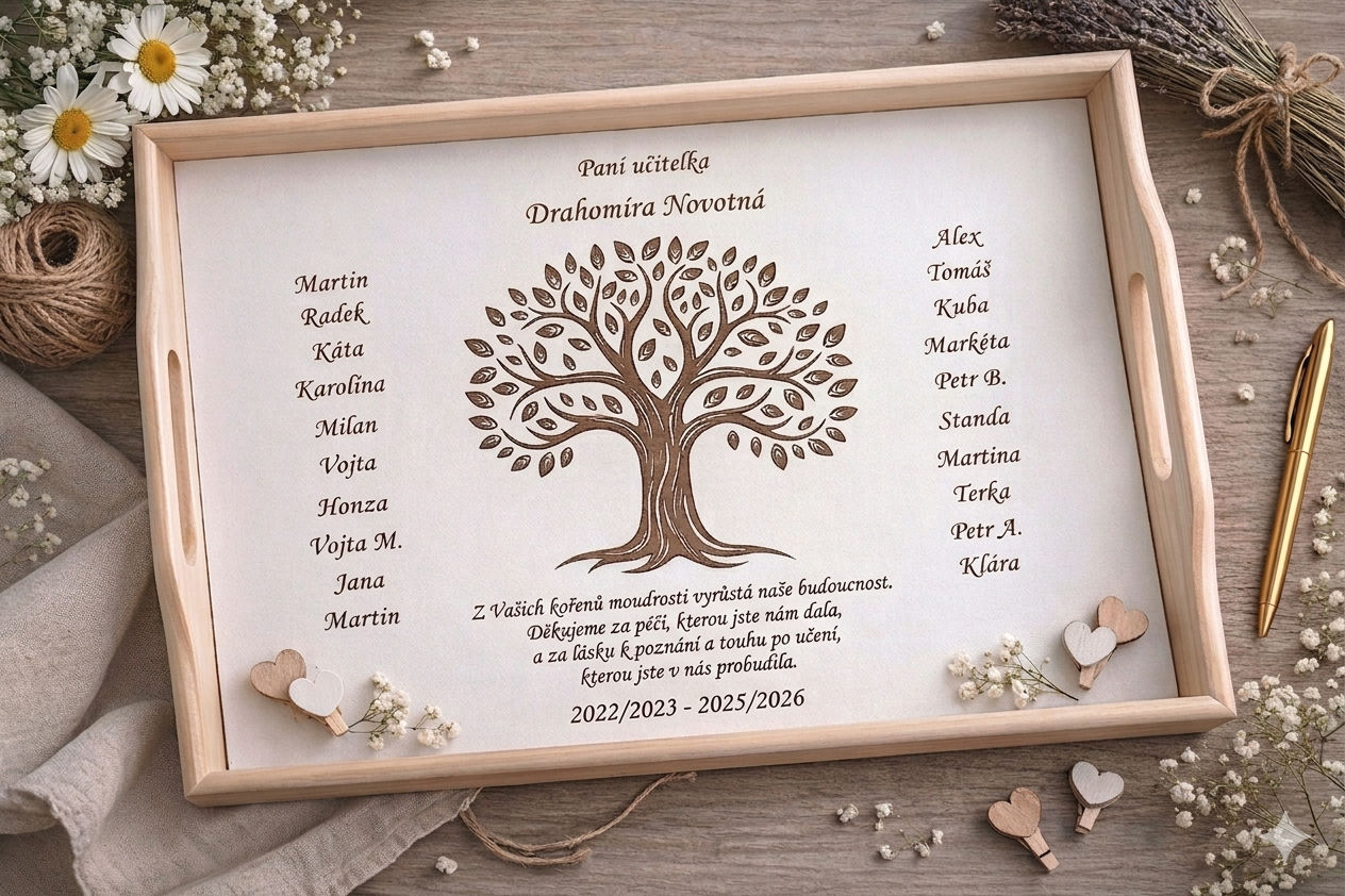Dřevěný podnos pro paní učitelku s gravírovaným stromem a jmény žáků 🎁