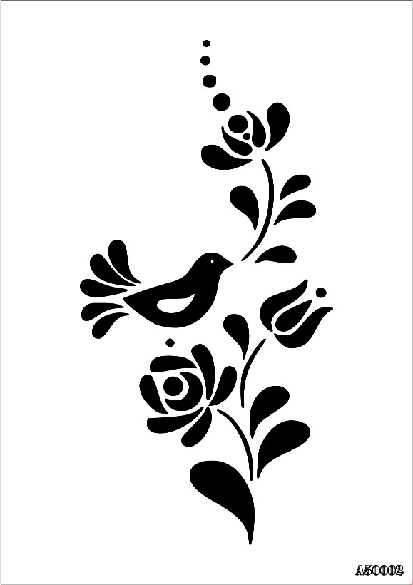 Plastová šablona pro nanášení vzoru na textil, dřevo, papír atd. Vyrobena je z průhledné, ohebné a přitom pevné fólie.