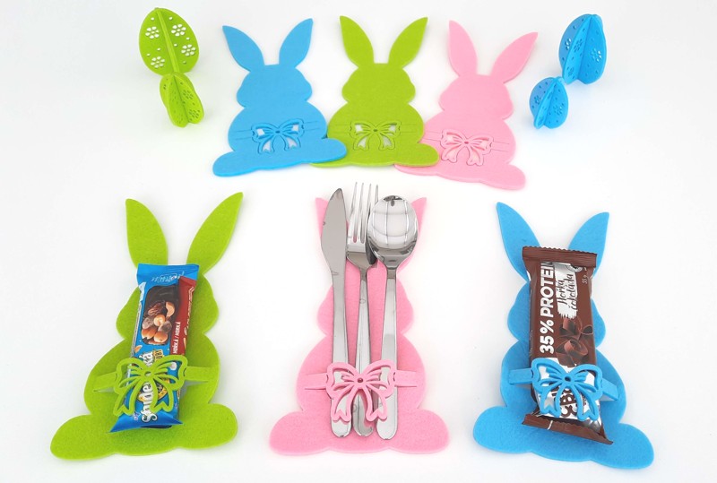 Sada dvou zajíčků pod příbory, nebo čokoládové tyčinky pro koledníky a dvou ozdobných vajec krásně dozdobí Váš velikonoční stůl.