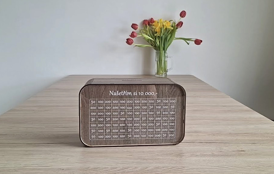 • ✍️ Nápis na přání: Výchozí texty na pokladničce jsou "Naspořím si 10 000,-", "30 000,-" nebo "50 000,-". Pokud ale chcete na pokladničku vygravírovat vlastní krátký text (např. "Na novou motorku", "Karlova tajná skrýš" nebo "Naše vysněná dovolená"), napište nám ho do poznámky k objednávce.