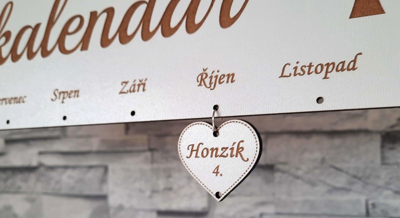S tímto rodinným kalendářem už nezapomenete na žádný svátek ani narozeniny Vaši blízké osoby. Kalendář je vyrobený z dřevovláknité bílé desky. V horní části má díry na zavěšení. Rozměr je 47 x 14 cm.