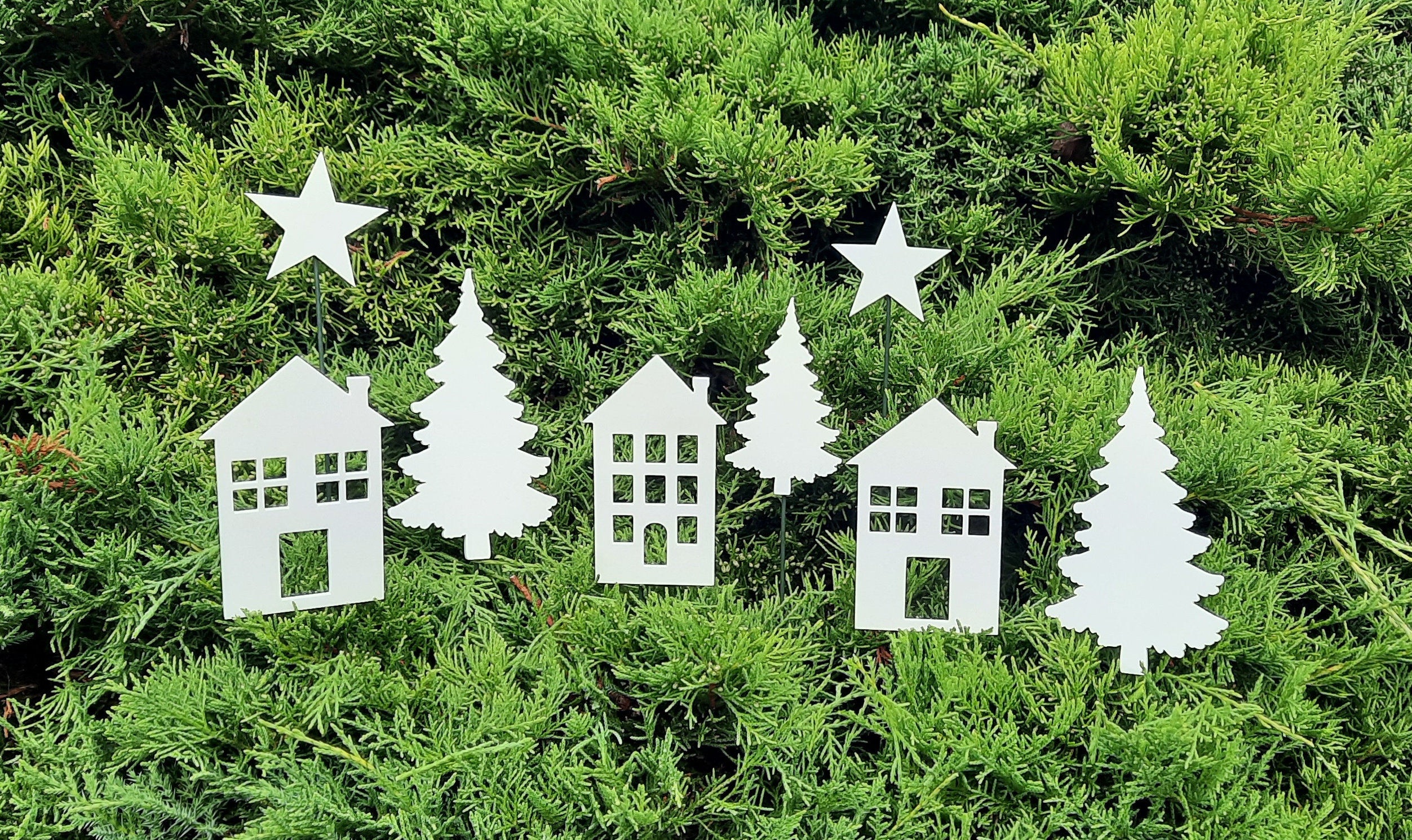 Vytvořte si v truhlíku vánoční vesničku. Sada zápichu obsahuje: