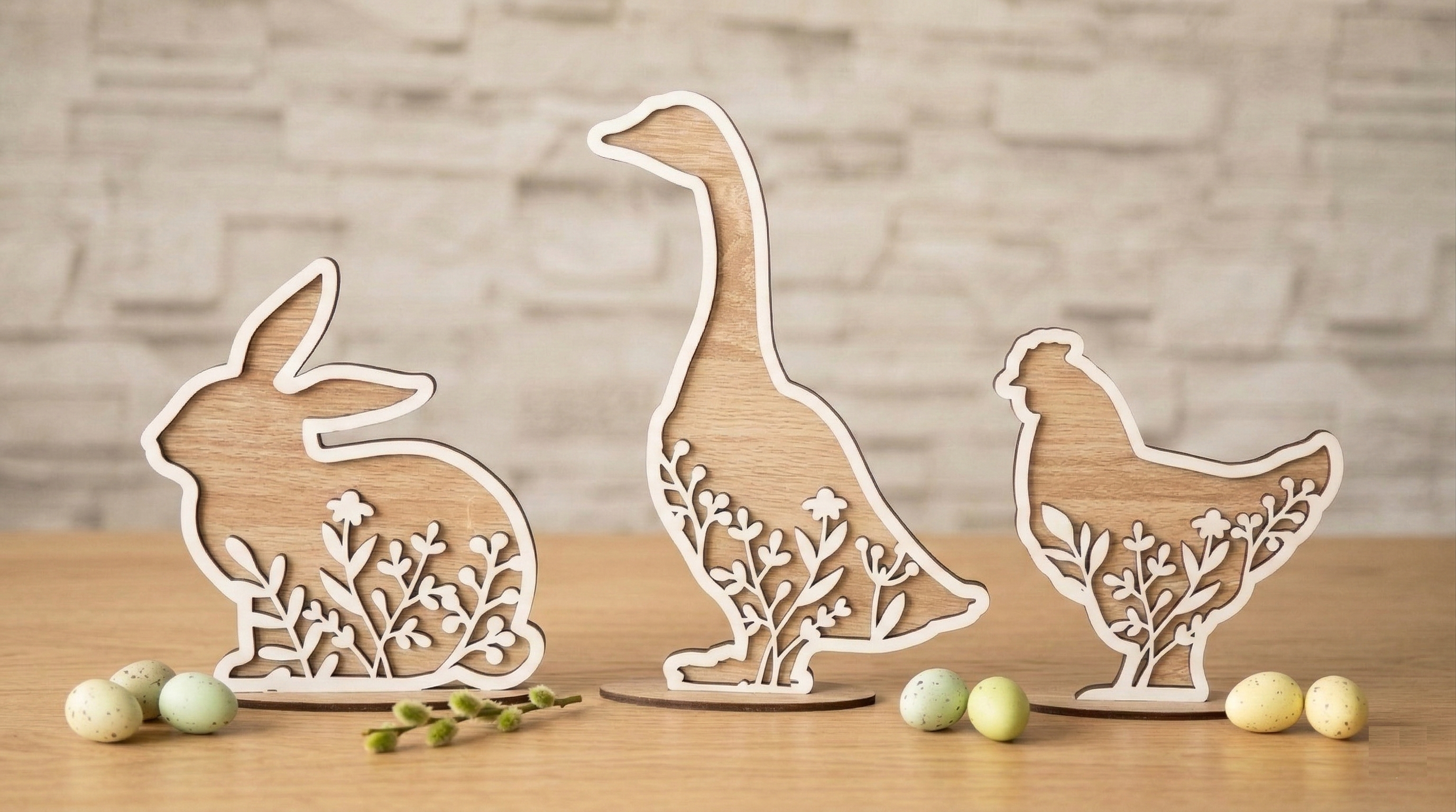 Přivítejte jaro a svátky jara s vkusnou dřevěnou dekorací, která okamžitě zútulní váš interiér. Tato série velikonočních zvířátek s prořezávaným motivem květin je ideálním doplňkem na svátečně prostřený stůl, okenní parapet nebo komodu.