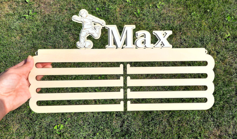 Věšák na medaile se jménem, vyrobený z dřevěného materiálu.