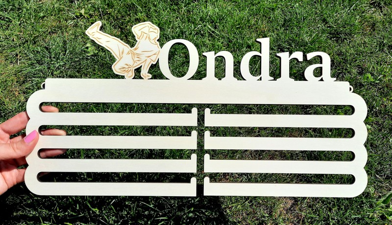 Kvalitní véšák na medaile se jménem ve světlém dekoru.