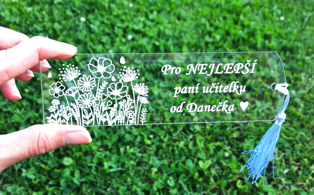 Průhledná gravírovaná záložka pro paní učitelku. Krásny dárek, který potěší.